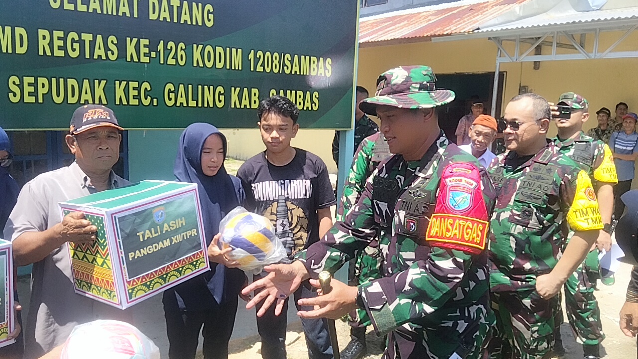 Sambas, Kalbar – Dalam rangkaian kegiatan TNI Manunggal Membangun Desa (TMMD) Reguler ke-126 Kodim 1208/Sambas, Tim Pengawasan dan Evaluasi (Wasev) dari Mabesad memberikan bingkisan kepada warga Desa Ratu Sepudak, Kecamatan Galing, Kabupaten Sambas, Kamis (30/10/2025).