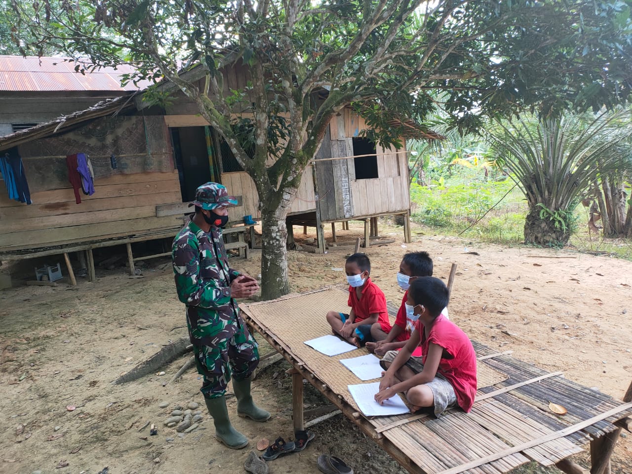 Kotabaru ,- Anggota satgas TMMD ke 112 kodim 1004/Kotabaru Serma Syahrul terlihat tampak sedang mengajari anak anak Desa Manunggul untuk belajar membaca dan menulis di salah satu pondok di Di Desa Manunggul Baru Kecamatan Sungai Durian Kabupaten Kotabaru.