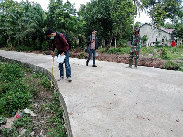 Dengan memegang kamera tampak anggota tim dari DPUPKP Kabupaten Kubu Raya mengabadikan hasil pengerjaan jalan rabat beton pada TMMD ke-111. Sesekali dari mereka mengeluarkan meteran mengukur hasil pengerjaan jalan meliputi ketinggian kelebaran dan ketebalan jalan untuk kemudian dicatat.