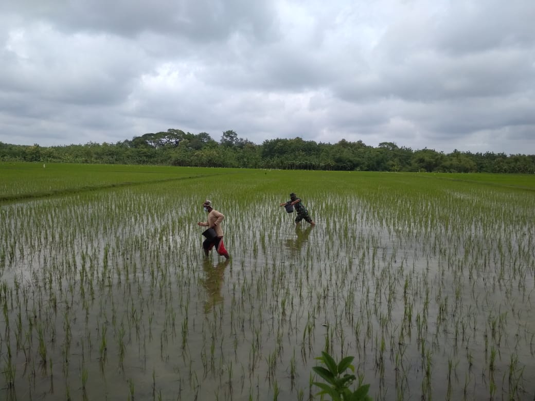 Dengan cara membantu melakukan pemupukan terhadap tanaman padi personel Satgas TMMD ke-110 Sertu Sugiono juga memberikan sosialisasi terhadap petani terkait pemupukan berkala untuk tanaman padi.