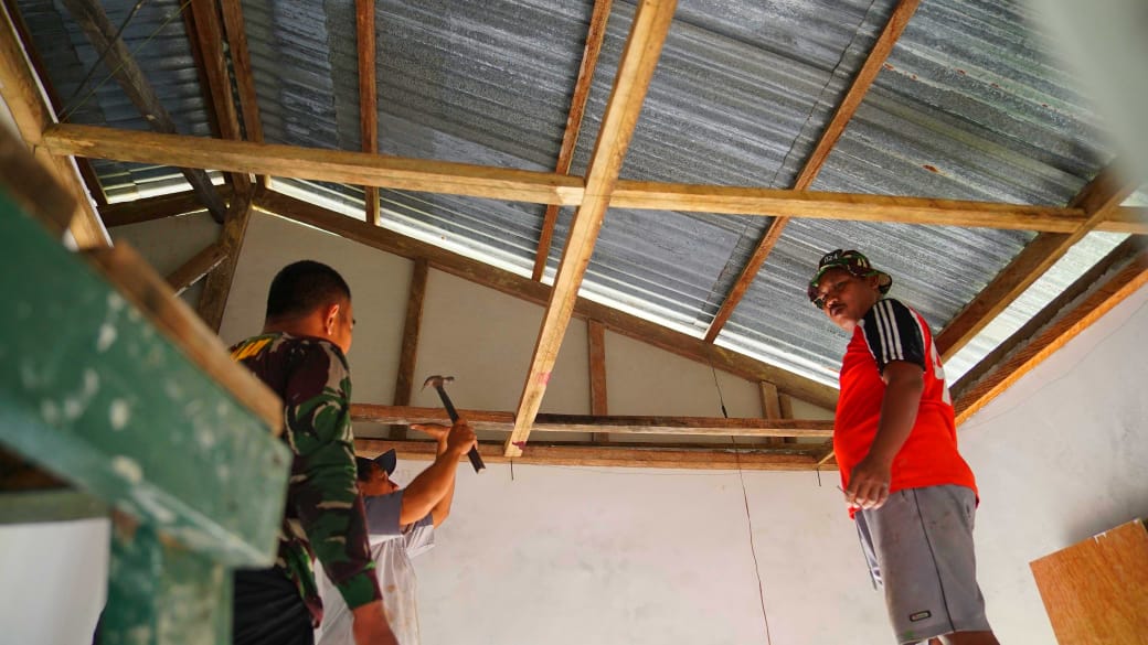 Bersama warga setempat, Satgas TMMD bahu membahu mengejar target pengerjaan rehab rumah ini agar cepat selesai dan bisa dimanfaatkan pemiliknya.