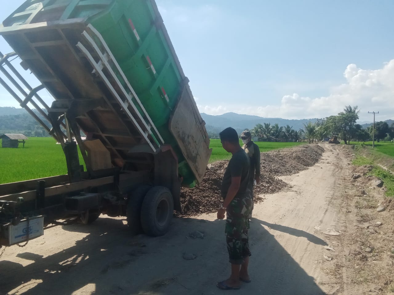 Timbun, meratakan hingga pengerasan jalan terus dilakukan anggota Satgas TMMD 125 Kodim 1417/Kendari bersama masyarakat meski di tengah cuaca yang panas.