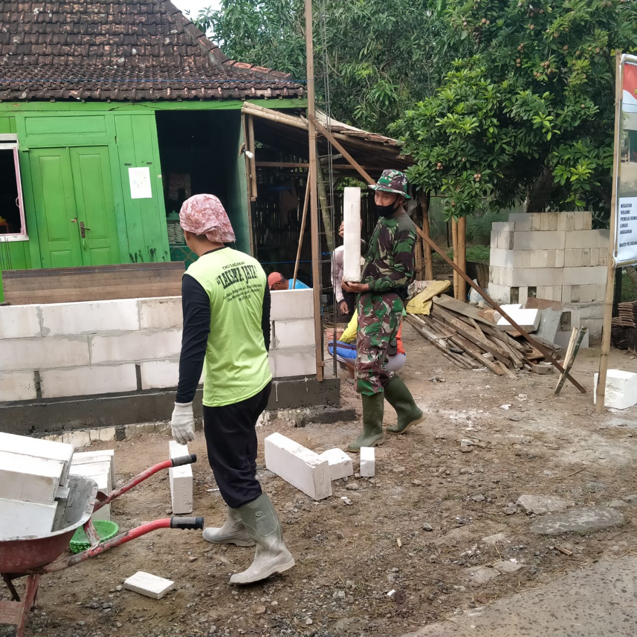 Salah satunya adalah Serda Heri Setiyawan, dia terlihat sedang membantu melangsir bata hebel. Dia merupakan anggota dari satuan koramil 11/Gembong, dimana saat ini dia diperbantukan untuk pembangunan.