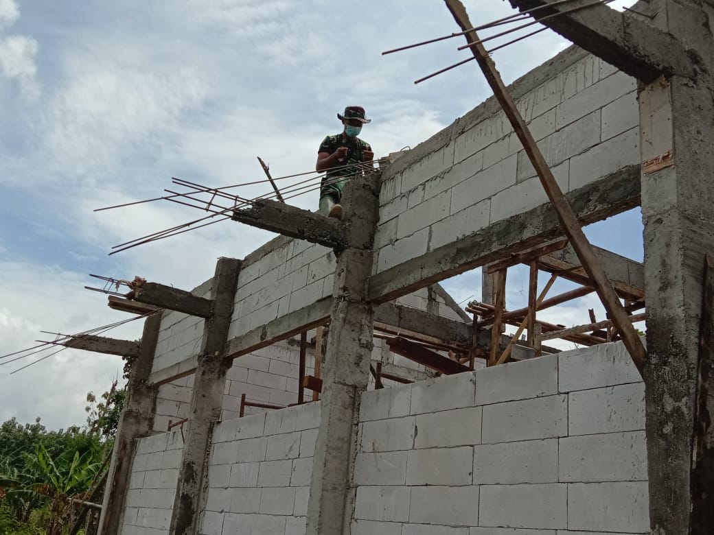 Bojonegoro – Tim teknik program TMMD ke 110 yang sedang melaksanakan kegiatan pemasangan cor untuk bagian atap dari ruang kelas SD Negeri 4 merancang Kecamatan Tambakrejo Kabupaten Bojonegoro ini mendapatkan pendampingan dari salah satu personel Satgas TMMD yaitu Pratu Meida, Sabtu (13/03/2021).