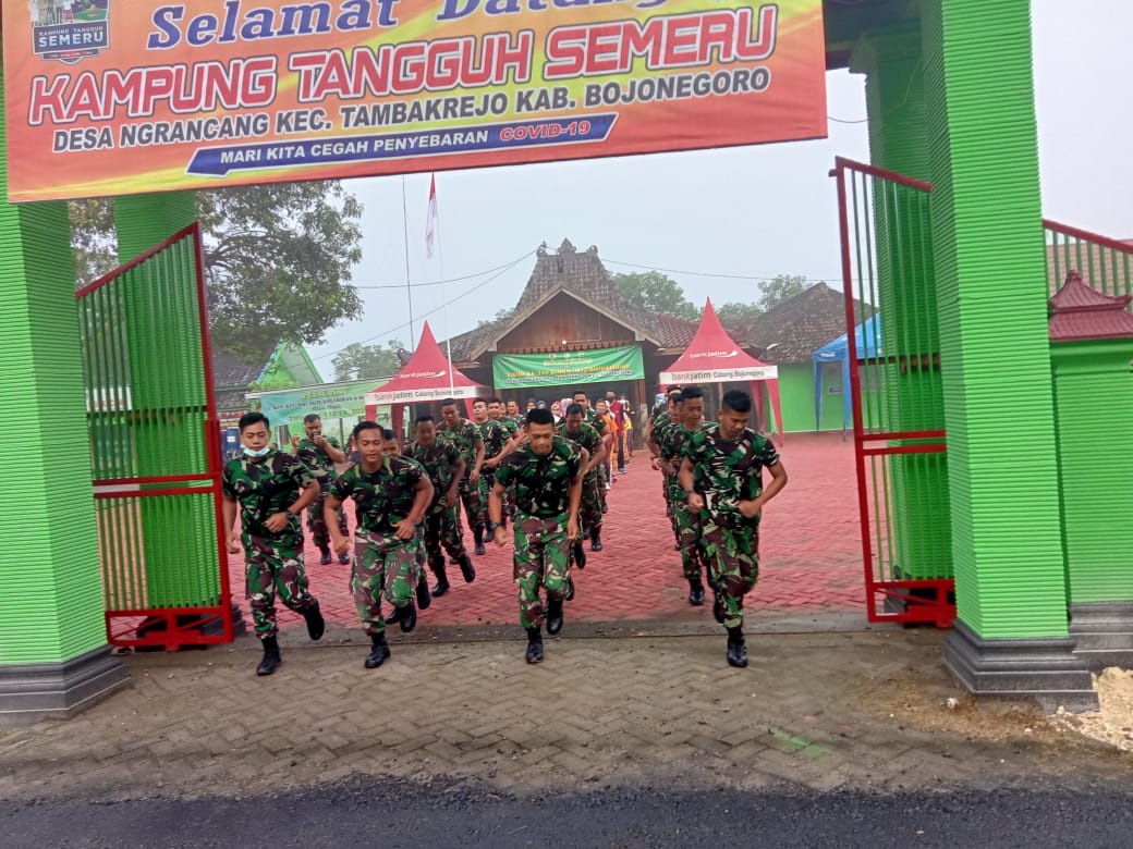 Tak terkecuali bagi para Satgas TMMD ke-110 Kodim 0813/Bojonegoro ini. Puluhan personil TNI tampak bersiap melakukan start joging di depan gerbang Balai Desa Ngrancang, Kecamatan Tambakrejo, Kabupaten Bojonegoro.
