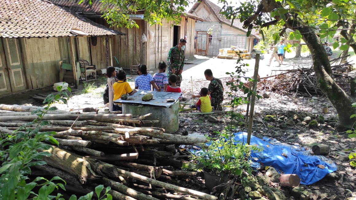 BOJONEGORO – Serda Dwi Permono Sudi Satgas TMMD ke-110 Kodim 0813/Bojonegoro membuatkan anak-anak mainan sederhana dari pelapah pisang, Rabu (17/3/2021).
