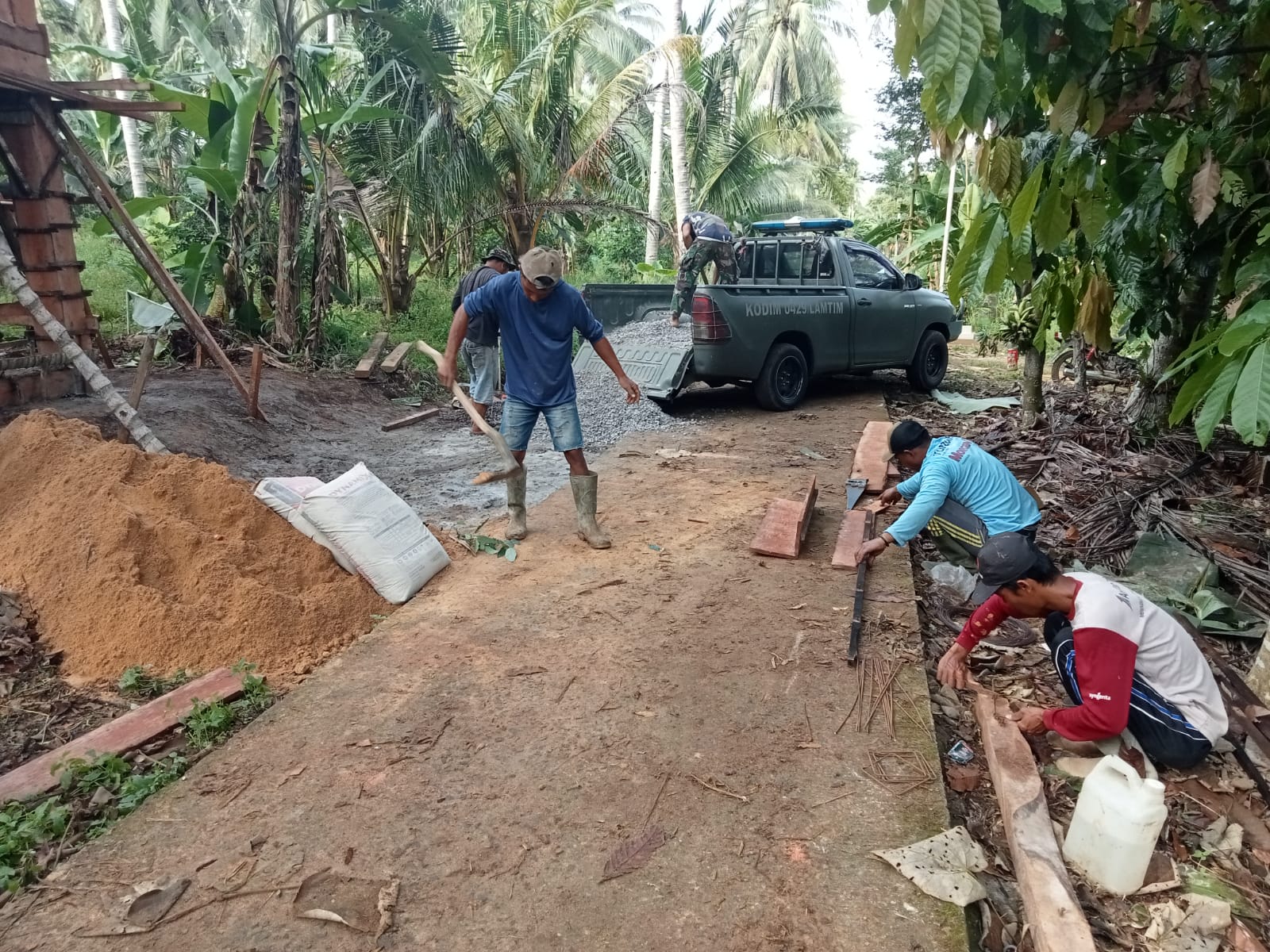 Saat ini pengerjaan yang dilakukan oleh Satgas memasuki tahap pengecatan dinding sambil menunggu pemasangan atap rangka baja seperti yang sudah terpasang di Poskamling Dusun 3.