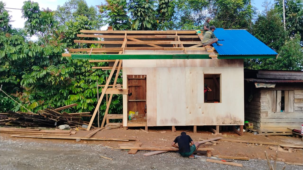 Progres terkini, seperti terlihat dalam gambar, menunjukkan pengerjaan pemasangan atap seng berwarna biru pada salah satu unit RTLH sasaran dua. Anggota Satgas bersama masyarakat bahu-membahu menuntaskan pekerjaan di tengah semangat gotong royong yang tinggi.