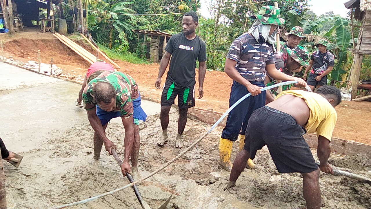 Pengecoran jalan yang bertujuan untuk meningkatkan konektivitas dan membuka isolasi wilayah tersebut, kini mulai terlihat wujudnya di Kampung Waropko. Anggota Satgas dan warga bekerja sama secara gotong royong, mencampurkan material dan meratakan adonan semen, sebuah pemandangan yang memperkuat sinergi antara TNI dan rakyat.