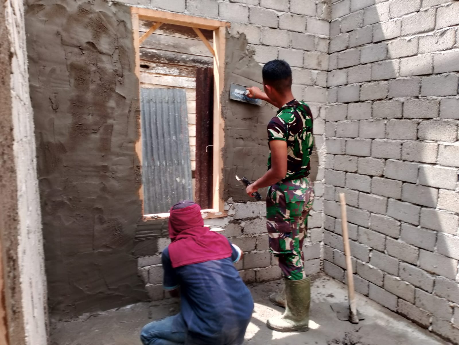 Untuk mempercepat penyelesaian pembangunan, Satgas TMMD dan masyarakat Desa Tanjung bahu membahu melanjutkan pemasangan kuda-kuda atap, plester dinding, serta penggalian septitank secara bersamaan.