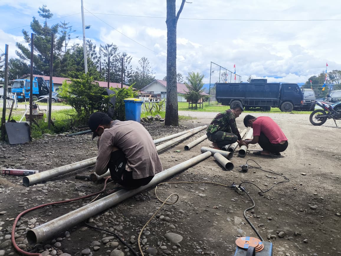 Wamena – Dalam rangka mendukung pengembangan sarana olahraga bagi masyarakat, Satgas TMMD ke-126 Kodim 1702/Jayawijaya melaksanakan kegiatan penyiapan tiang gawang yang akan diberikan kepada pemuda di Distrik Pyramid, Kabupaten Jayawijaya, Selasa (14/10/2025).