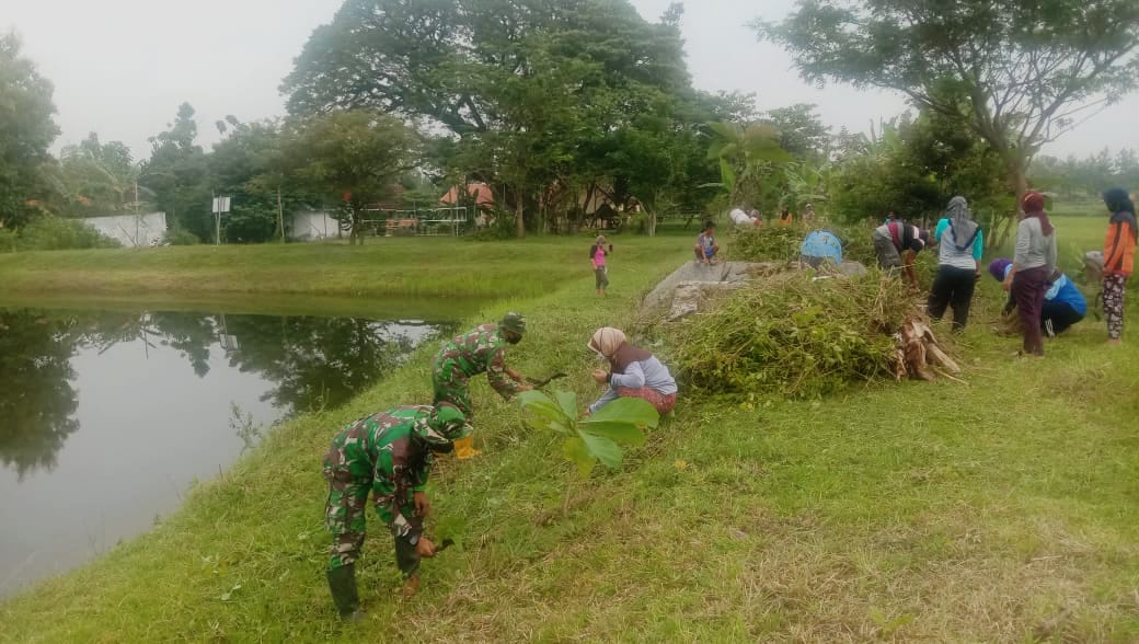 Minggu, 7/3/21 Kopda Puntiono nampak membantu ibu-ibu warga Desa Jatimulyo, saat gotong-royong membersihkan Embung.