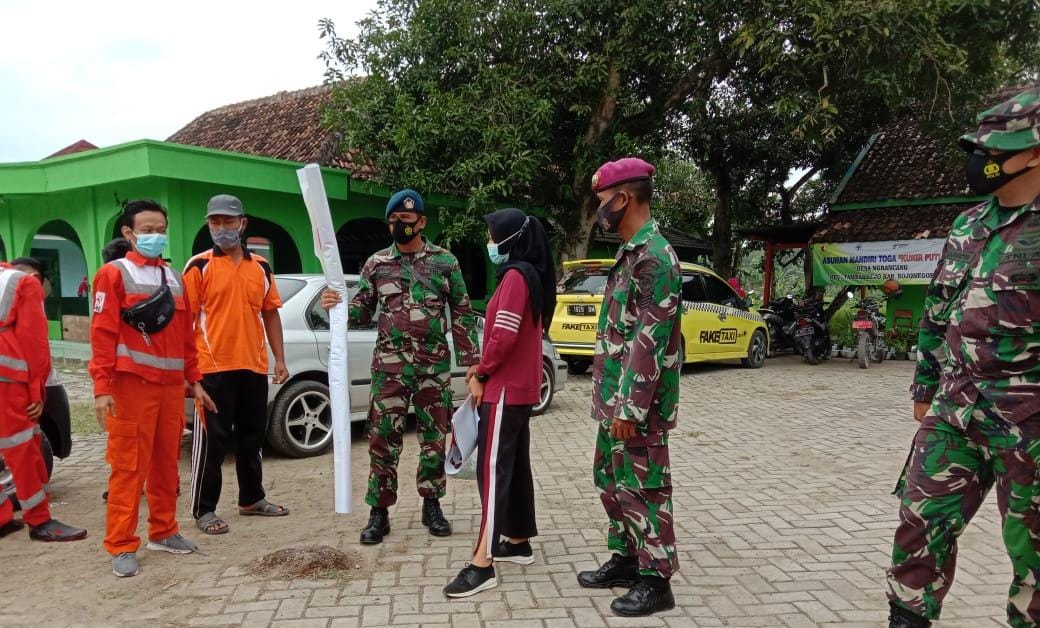 Bojonegoro – Selain melakukan penyemprotan Disinfektan secara bersama sama dengan Tim Satgas Kodim 0813/Bojonegoro, di berbagai lingkungan rumah warga dan juga fasilitas umum dilokasi TMMD di Desa Jatimulyo dan Ngrancang Kecamatan Tambakrejo, juga memberikan spanduk himbuan, Kamis (11/3/2021).