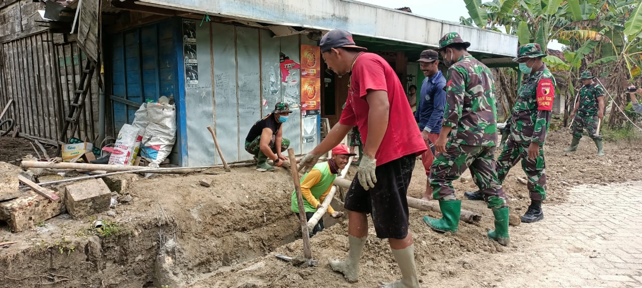 Anggota Satgas TMMD ke 110 Kodim 0813/Bojonegoro DPP Sertu Eko Wahyudi dan rekan-rekan anggota Yonif 521 melaksanakan pembuatan gorong-gorong Dusun Nglambangan RT 02 RW 01 Jatimulyo, Rabu (10/03/2021).