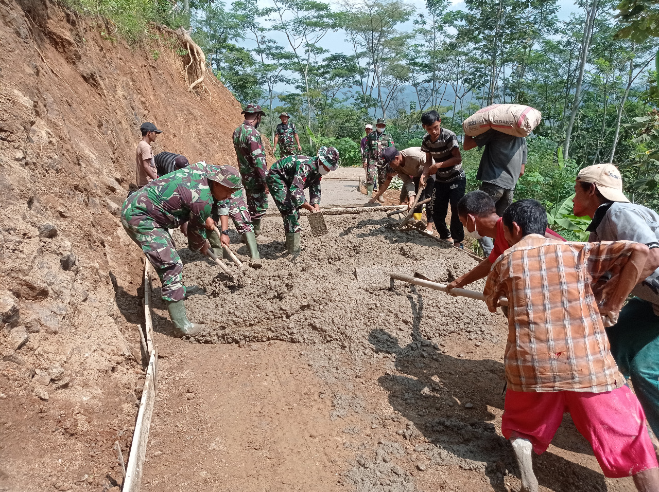 Banjarnegara – Sejumlah TNI Satgas dan warga yang terlibat di pembangunan jalan, salah satu sasaran fisik TMMD Reguler ke-111 Kodim 0704/ Banjarnegara, Desa Kebutuhjurang Kecamatan Pagedongan Kabupaten Banjarnegara, Jawa Tengah, tengah dilakukan finishing. Jumat (02/7/21).
