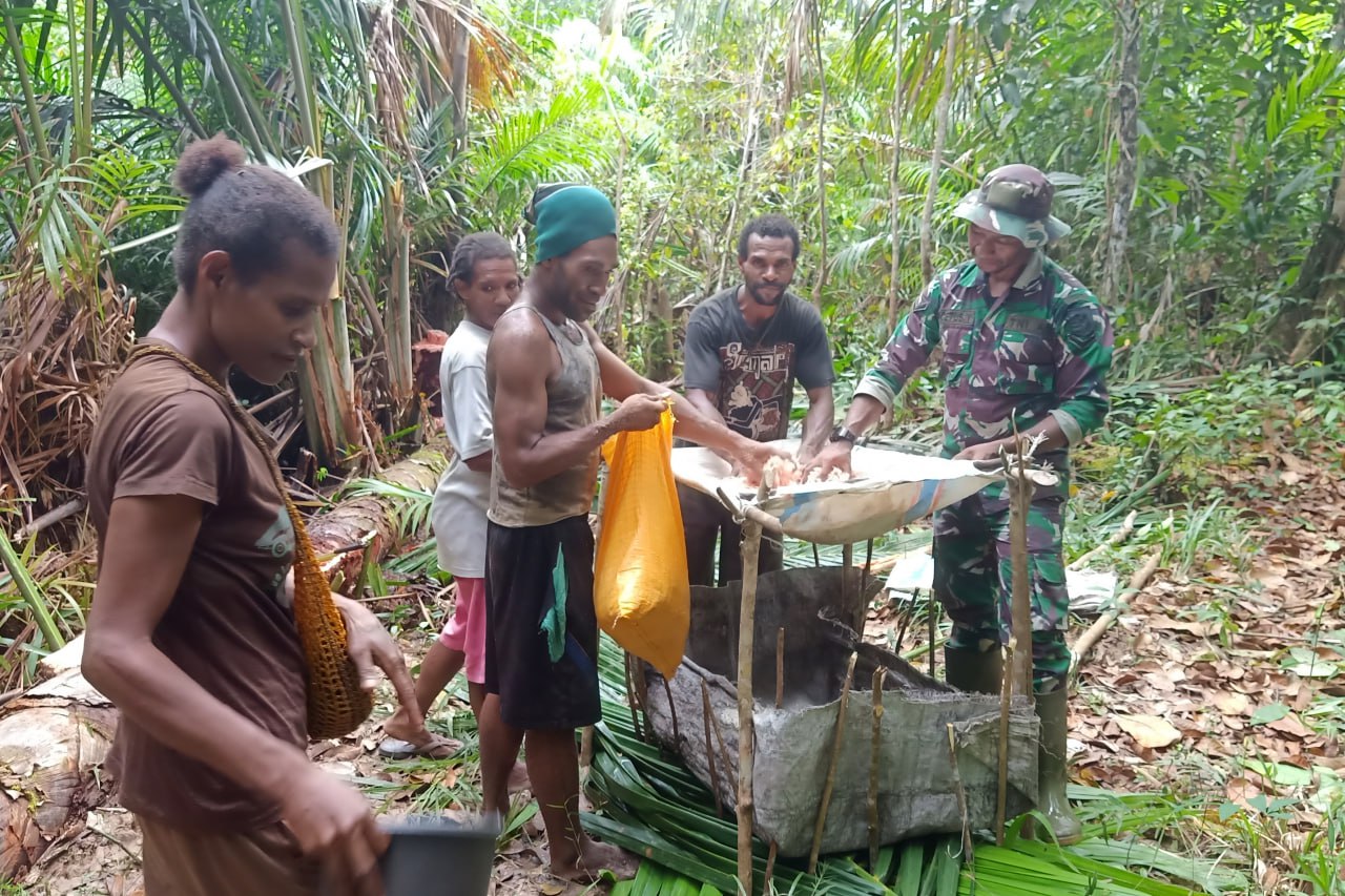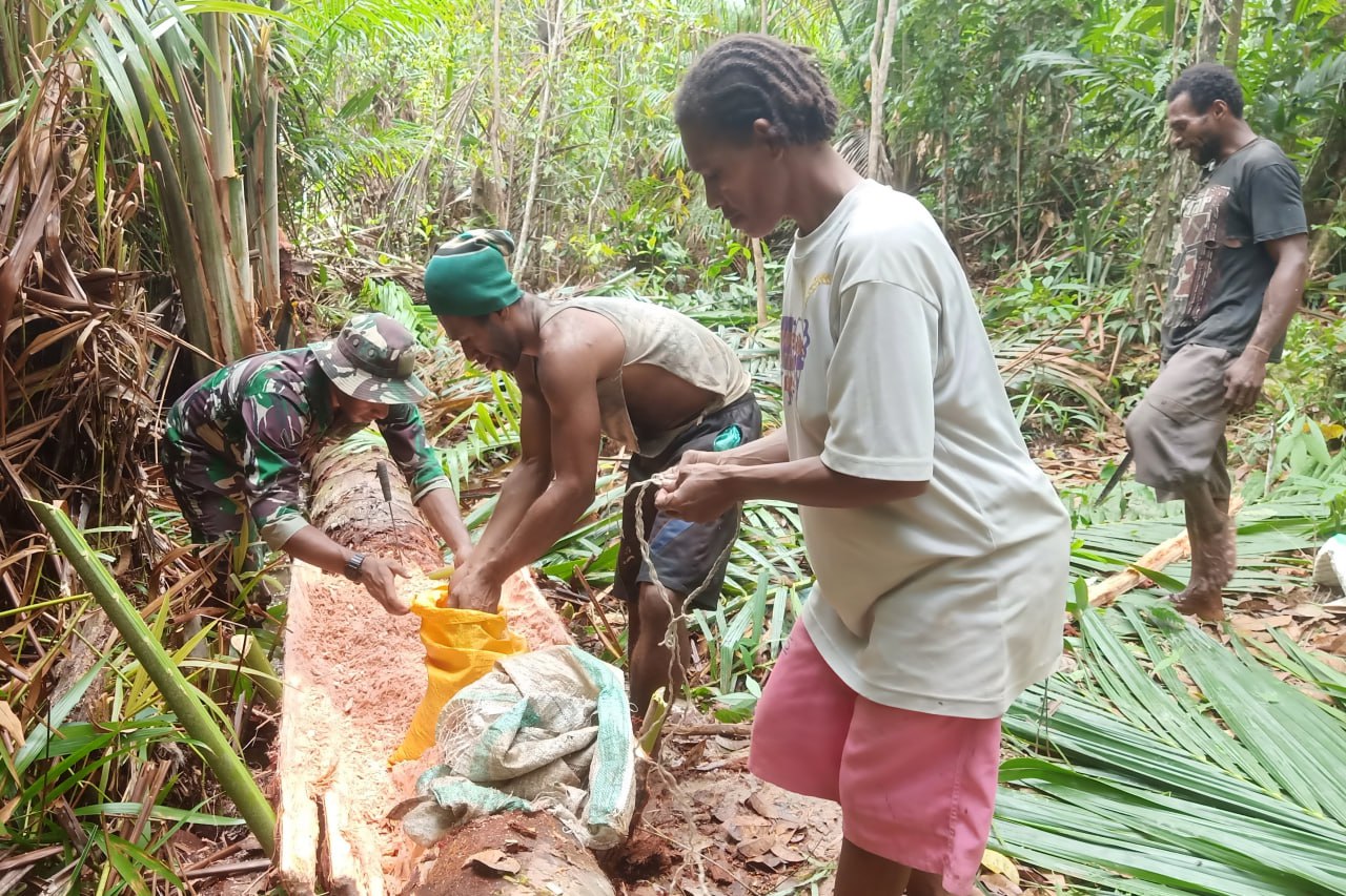 Demikian pula hal yang sama juga dilakukan oleh personel Satgas TMMD Ke-116 di sela-sela kegiatan TMMD ikut membantu warga setempat melaksanakan pekerjaannya sehari-hari seperti memangkur sagu dan menyadap getah karetuntuk meringankan beban tenaga guna memenuhi kebutuhan sehari-hari.