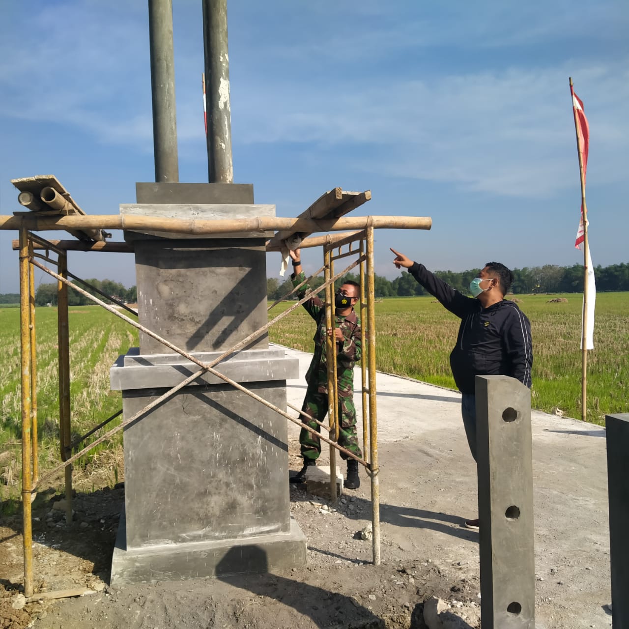 Beberapa anggota TNI Satgas TMMD masih terlihat dilokasi. berada Diawal pintu masuk arah jalan desa yang menjadi pusat kegiatan anggota TNI dalam kegiatan TMMD lalu, mereka sedang membangun sebuah tugu prasasti.