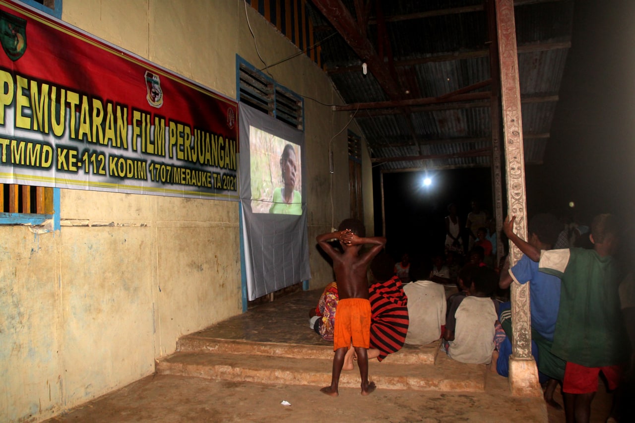 MERAUKE – Untuk menumbuhkan semangat dan jiwa patrotisme, personel Satgas TMMD ke-112 Kodim 1707/Merauke gelar nonton bareng film perjuangan bersama masyarakat Kampung Okor, di Distrik Haju Kabupaten Mappi.