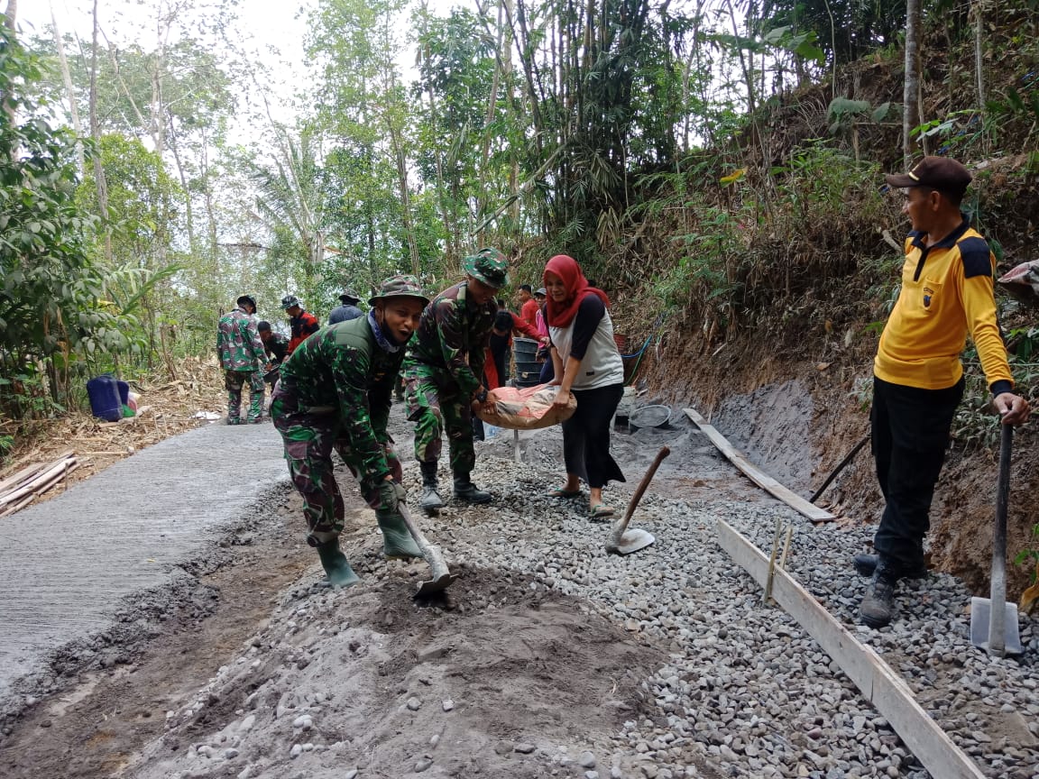 Purworejo-Tanpa rasa lelah dan semangat yang tinggi itulah yang nampak terlihat di wajah ibu sumiyati salah satu warga Desa Benowo yang turut bergotong royong membantu Satgas TMMD 118 dengan mengangkut material di lokasi rabat beton.Sabtu(14/10/23)