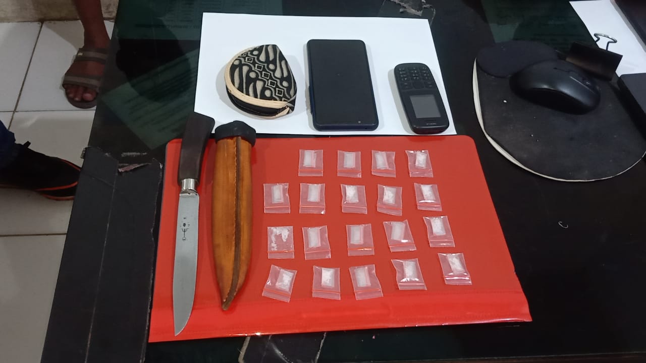 Barang haram itu didapat dari temannya berinisial HN dan sudah melakukan bisnis haram ini satu tahun lebih. “Aku cuma disuruh jual bae Pak. Kalau pisau itu dipakai untuk berjaga jaga,” ujar tersangka.
