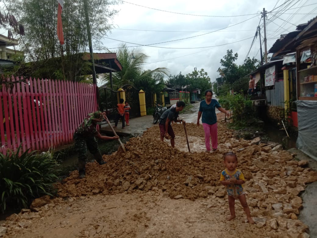 Sorong Papua Barat. Sabtu(09/10/2021),- Upaya nyata dan membaur dengan masyarakat bahu membahu bekerja bersama sama dengan masyarakat di wilayah binaan ini yang dilakukan oleh Babinsa Koramil 1802-01/Sorong Kota Sertu Agus Hariyanto dengan warga binaan menimbun jalan yang berlobang dan tergenang air di karenakan curah hujan yang tinggi, bertampat di Jalan Bima, Kompleks Warga Rt 02 Rw 02 Kelurahan Malasilen, Distrik Malaisimsa,Kota Sorong.