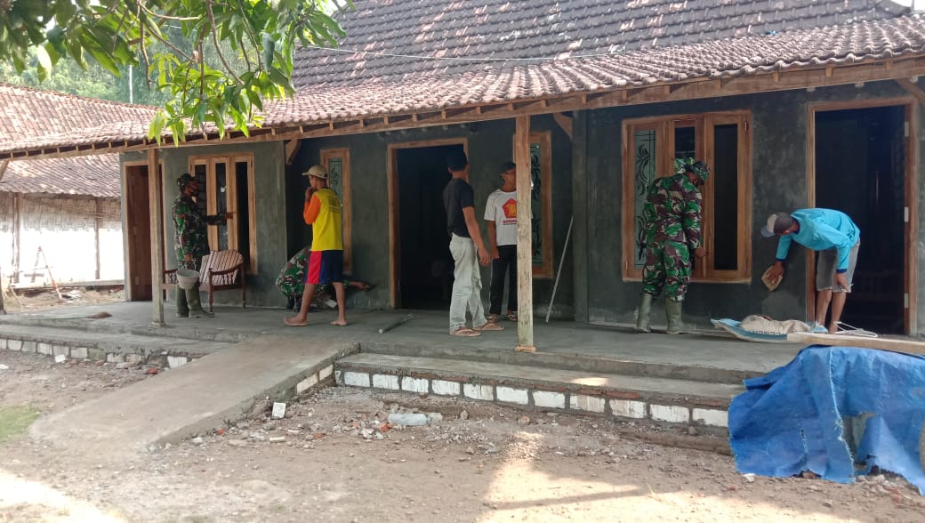 Pati – Anggota Satgas TNI Manunggal Membangun Desa (TMMD) Reguler Ke-111 Kodim 0718/Pati bersama warga telah selesai mengerjakan plester dinding Rumah Tidak Layak Huni (RTLH) milik Sukur (47), pengerjaan sasaran fisik rehab rumah terus dikebut. Sabtu (26/6/2021)