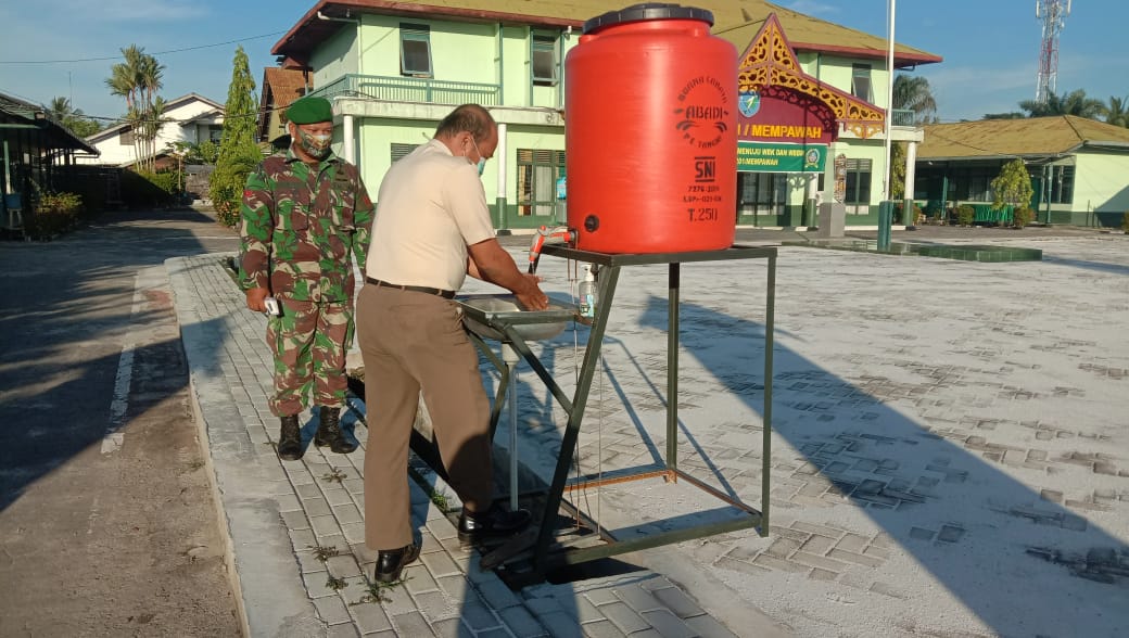 Mempawah – Sebagai langkah mengantisipasi penyebaran Covid-19 terhadap prajurit, PNS dan keluarga di jajaran Kodim 1201/Mph, Komandan Kodim (Dandim) 1201/Mph Letkol Inf Dwi Agung Prihanto menginstruksikan petugas piket untuk memeriksa suhu tubuh personil maupun masyarakat yang masuk Asrama Makodim menggunakan alat pengukur suhu Medical Thermometer Infrared.
