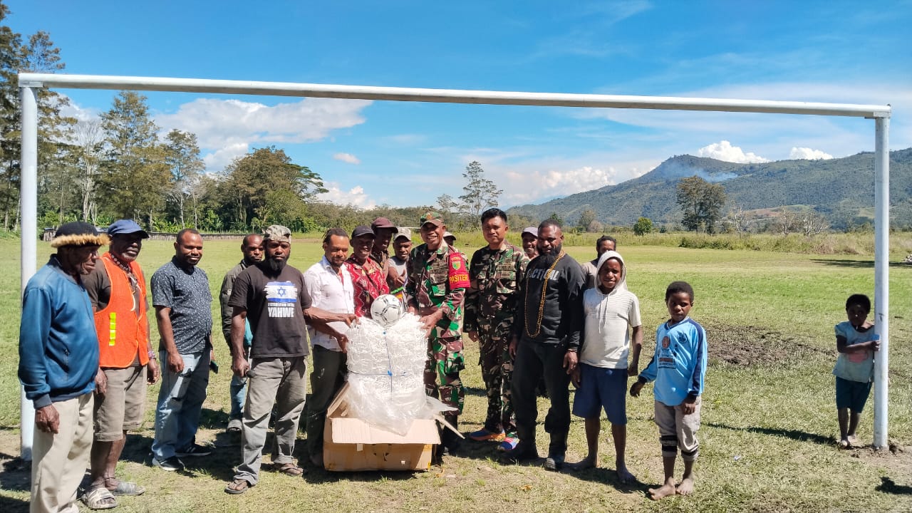Wamena – Dalam rangka mendukung pengembangan potensi generasi muda dan mempererat tali persaudaraan dengan masyarakat, Satgas TMMD Ke-126 Kodim 1702/Jayawijaya menyerahkan bantuan berupa bola dan jaring gawang kepada pemuda Kampung Algonik, Distrik Piramid, Kabupaten Jayawijaya. Jumat (17/10/2025).
