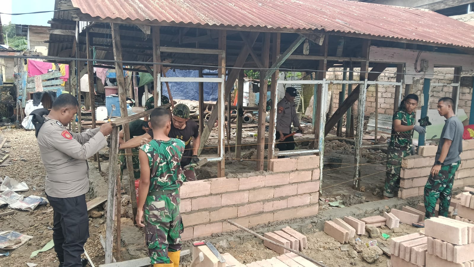 Saat ini, para personel di lapangan tengah bahu-membahu melaksanakan tahap pemasangan batu bata untuk membangun dinding rumah warga yang menjadi sasaran program.